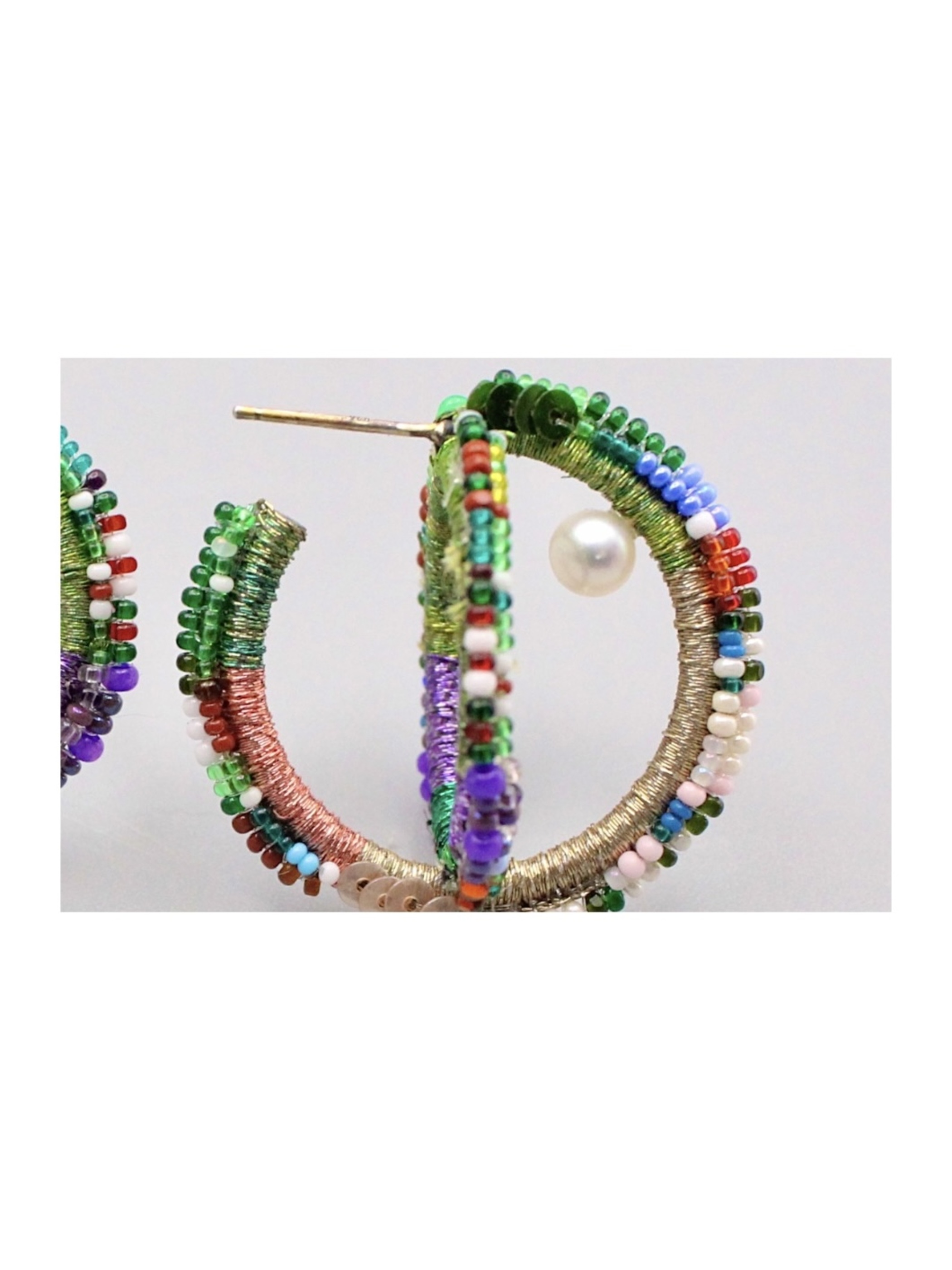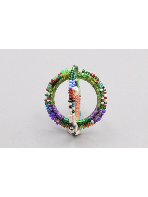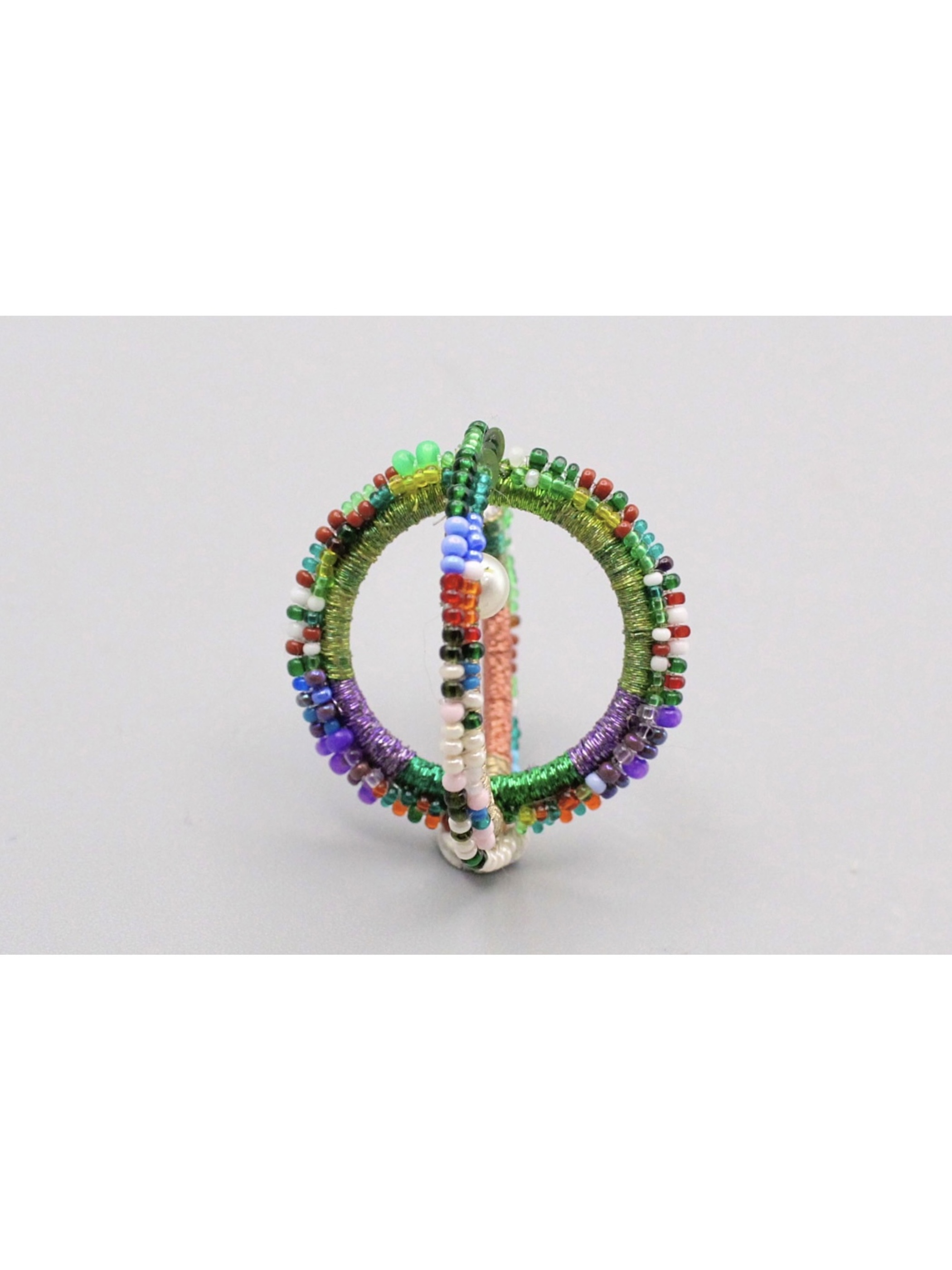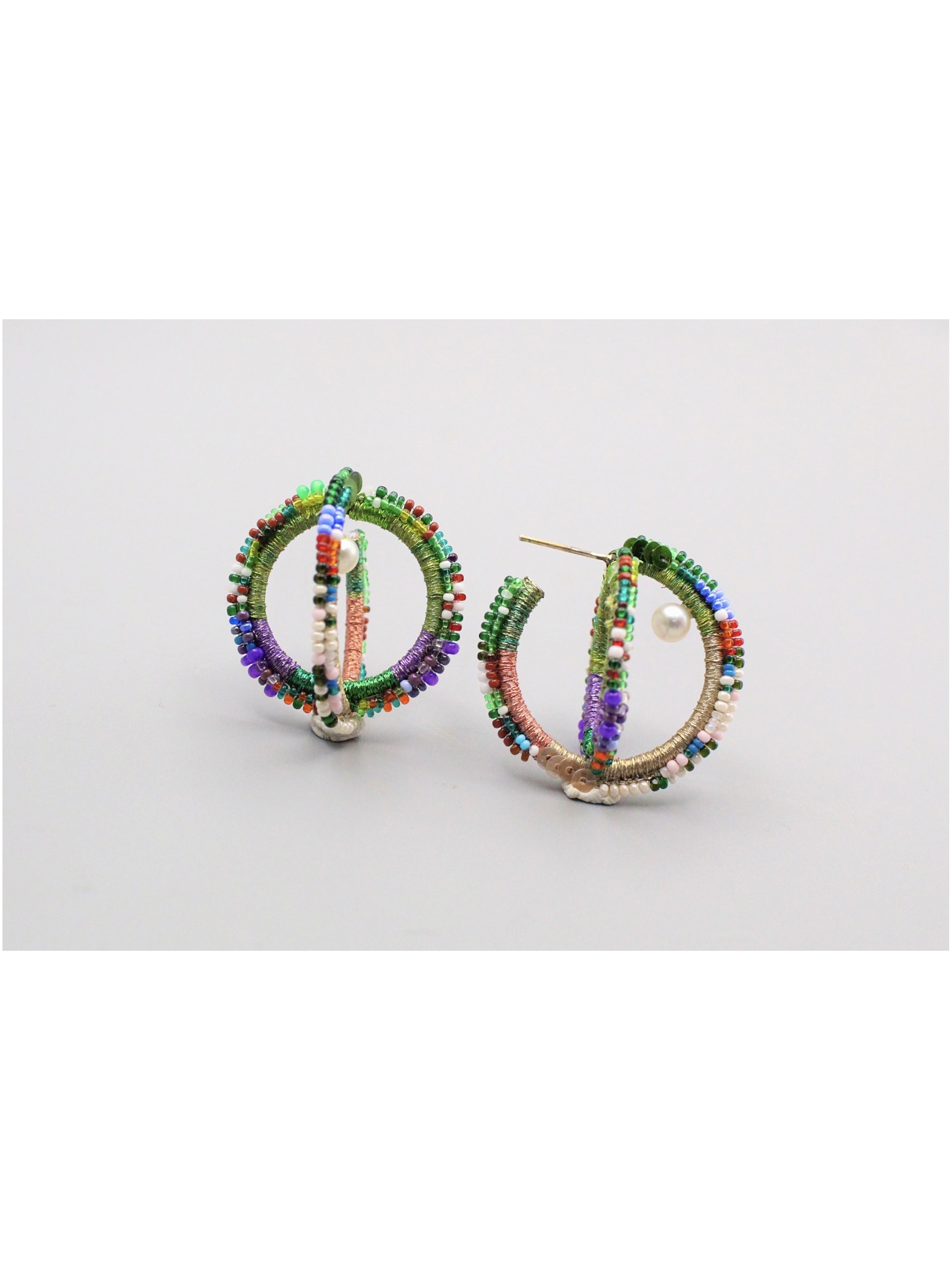 真ん中の縦に走る線を小道、重なるサークルの両サイドを小道の脇に咲く草花を数十種類のglass beadsを全てにびっしりと二重に装飾して奥行きや絵が表す色の重なりを作りました。