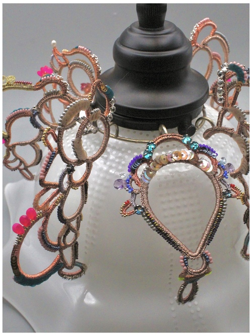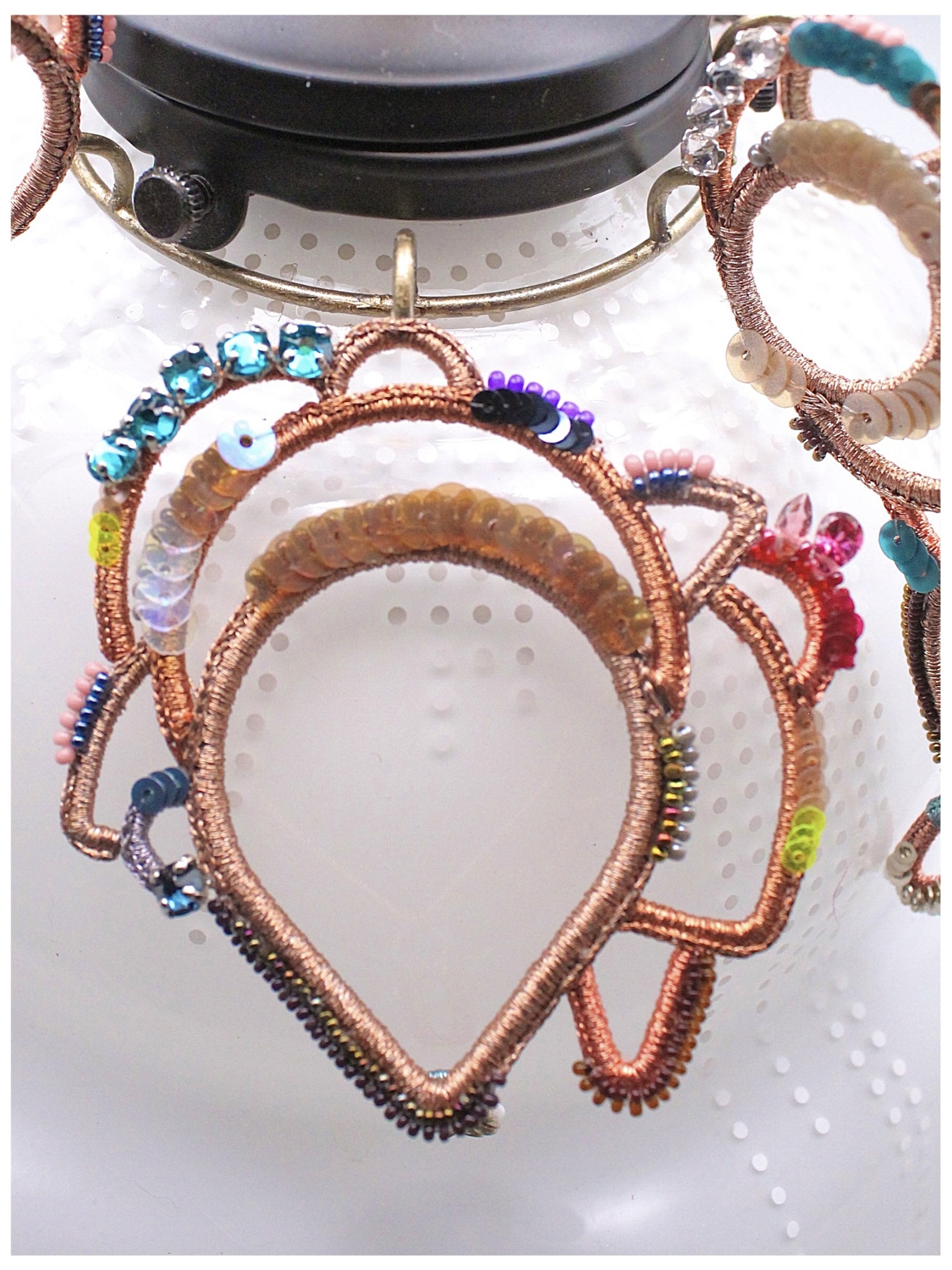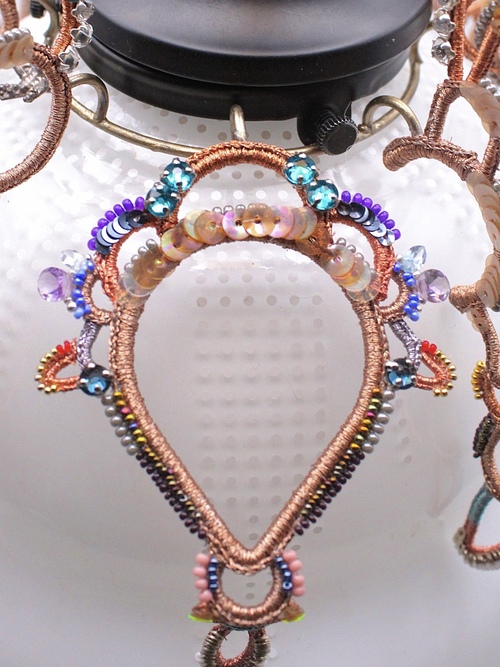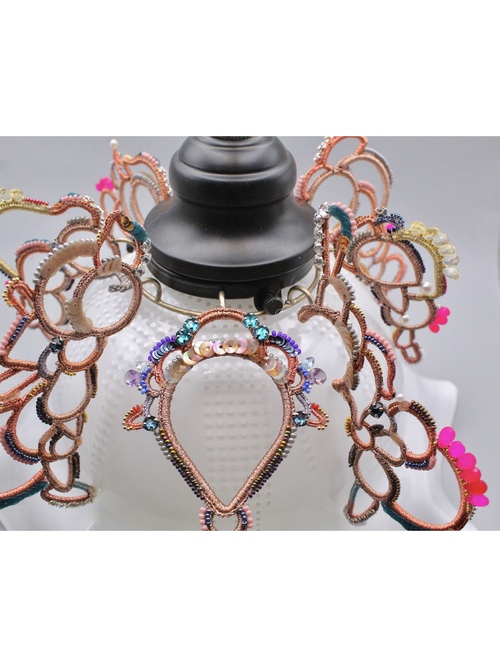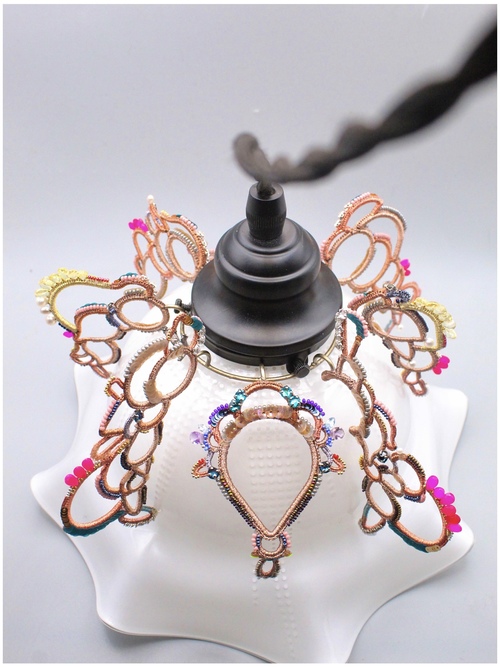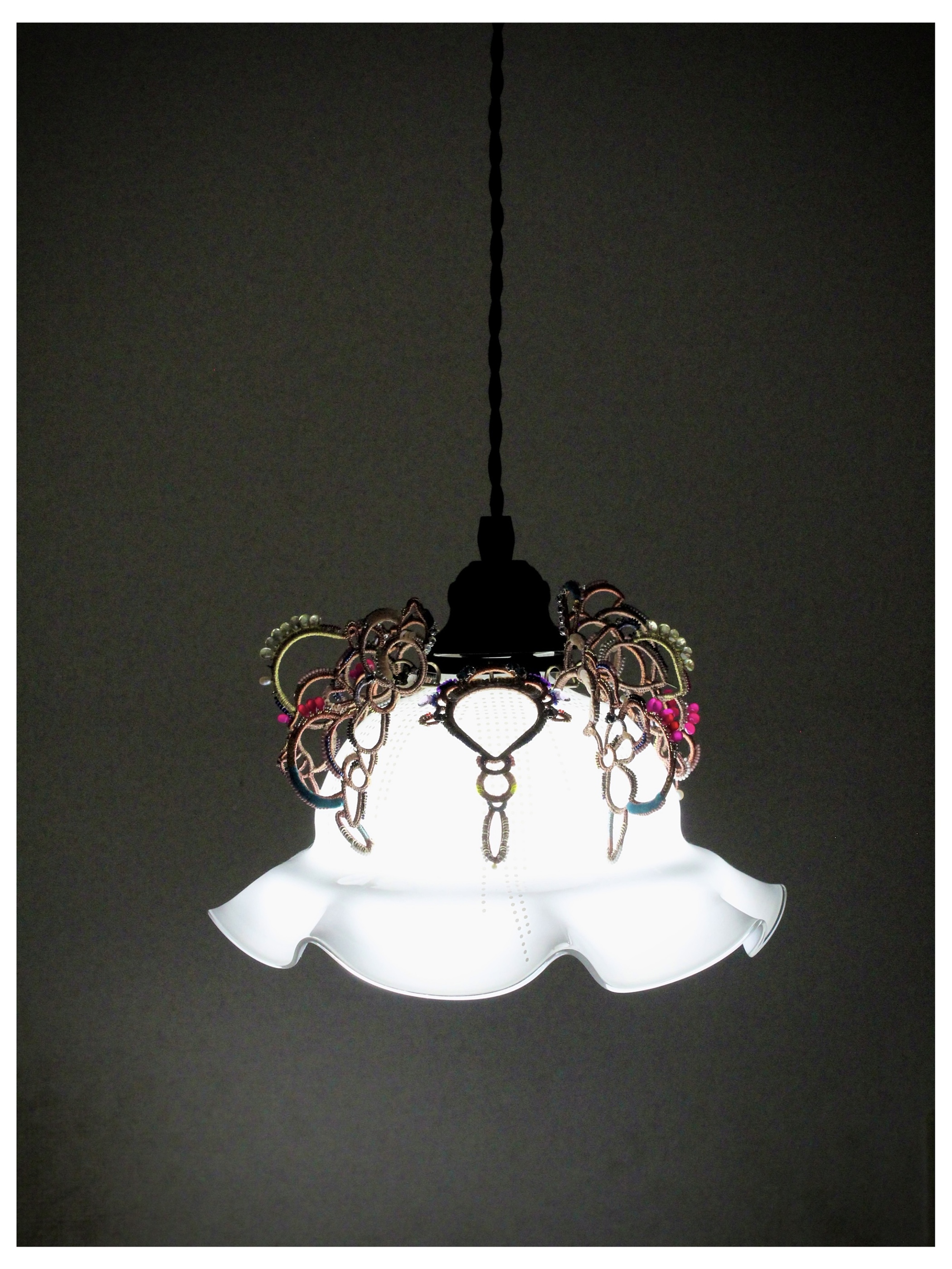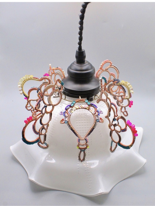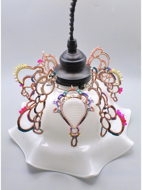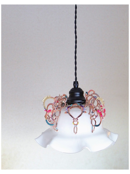 今まではオリジナルの柄を転写して作り上げて来ましたが、今回は新たにKNITTINGのモチーフをドッキングさせました。シェードの曲線に沿って包み込む様に放射状に1つずつ違うデザインのモチーフを装着しました。