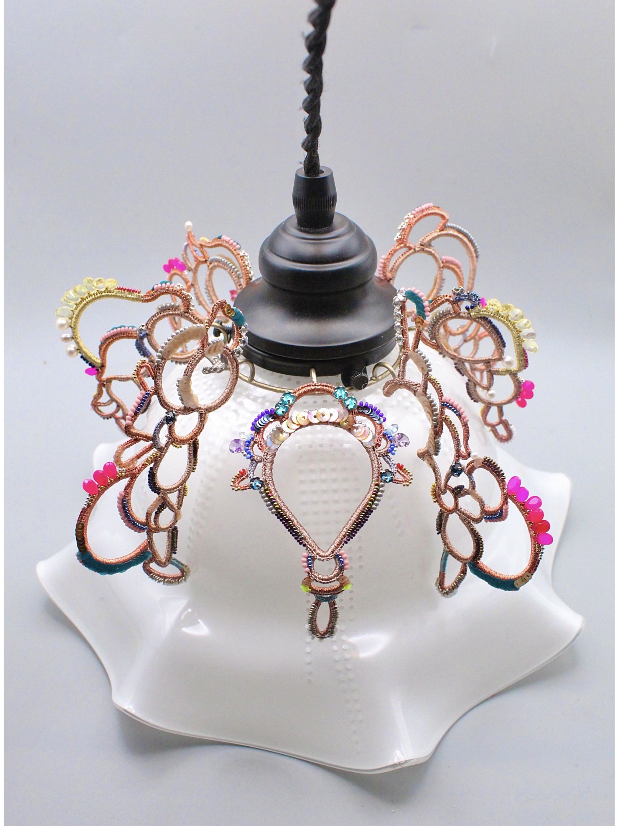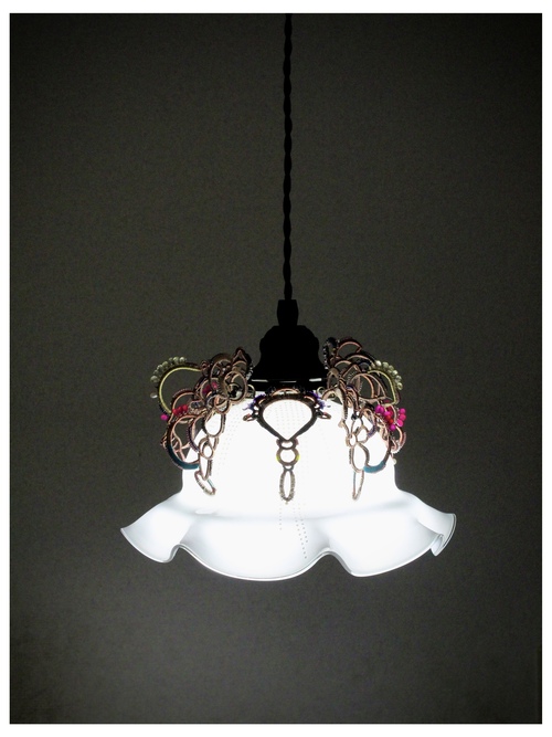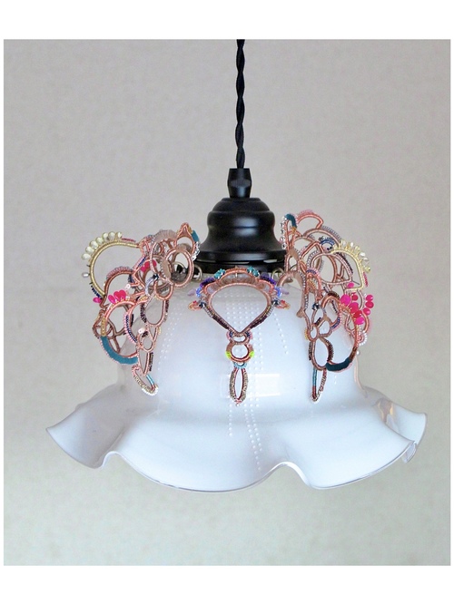 今回はフランスの古いANTIQUEでフリルの曲線が美しいミルクガラスのシェードをベースに使用しました。