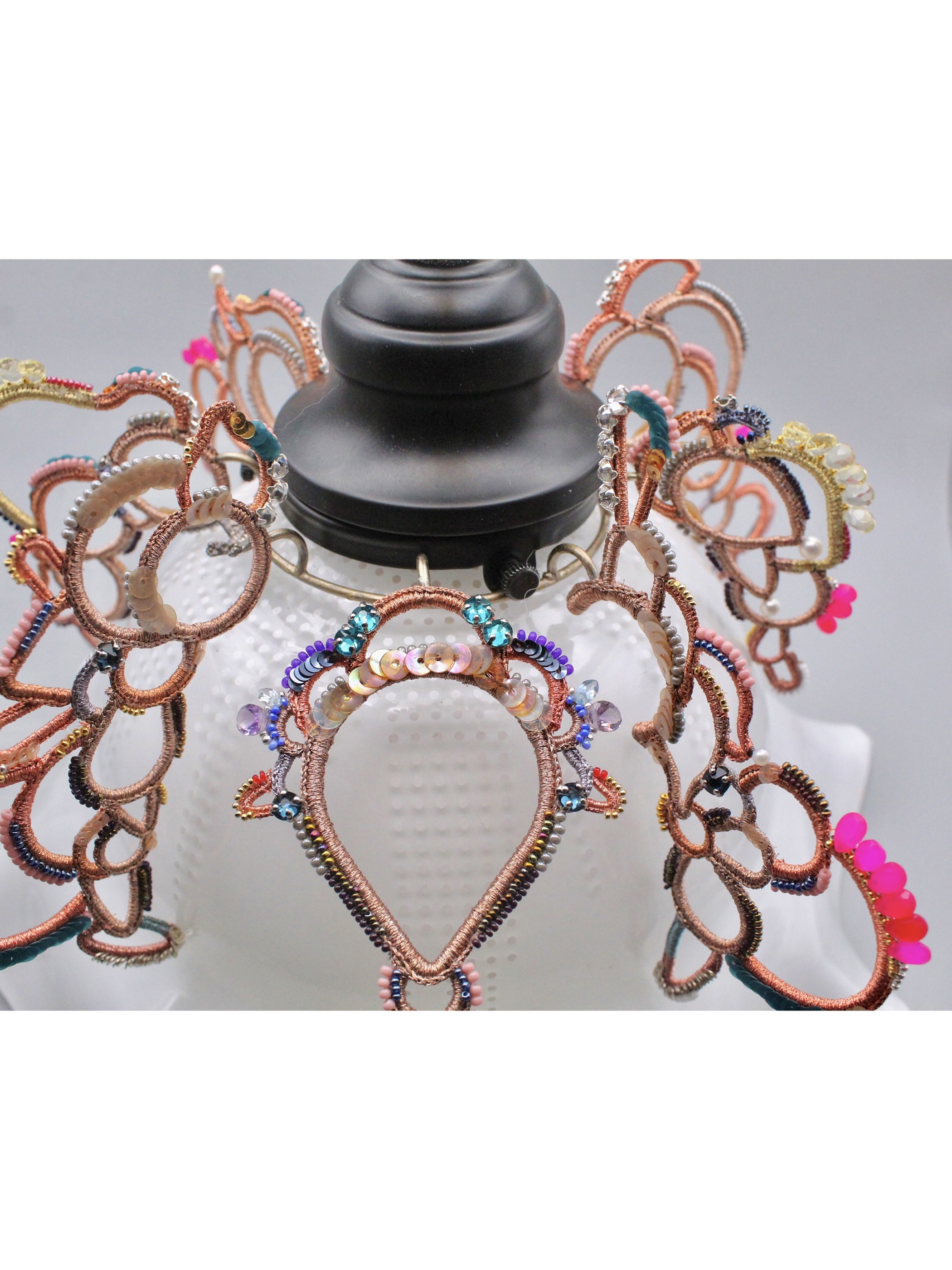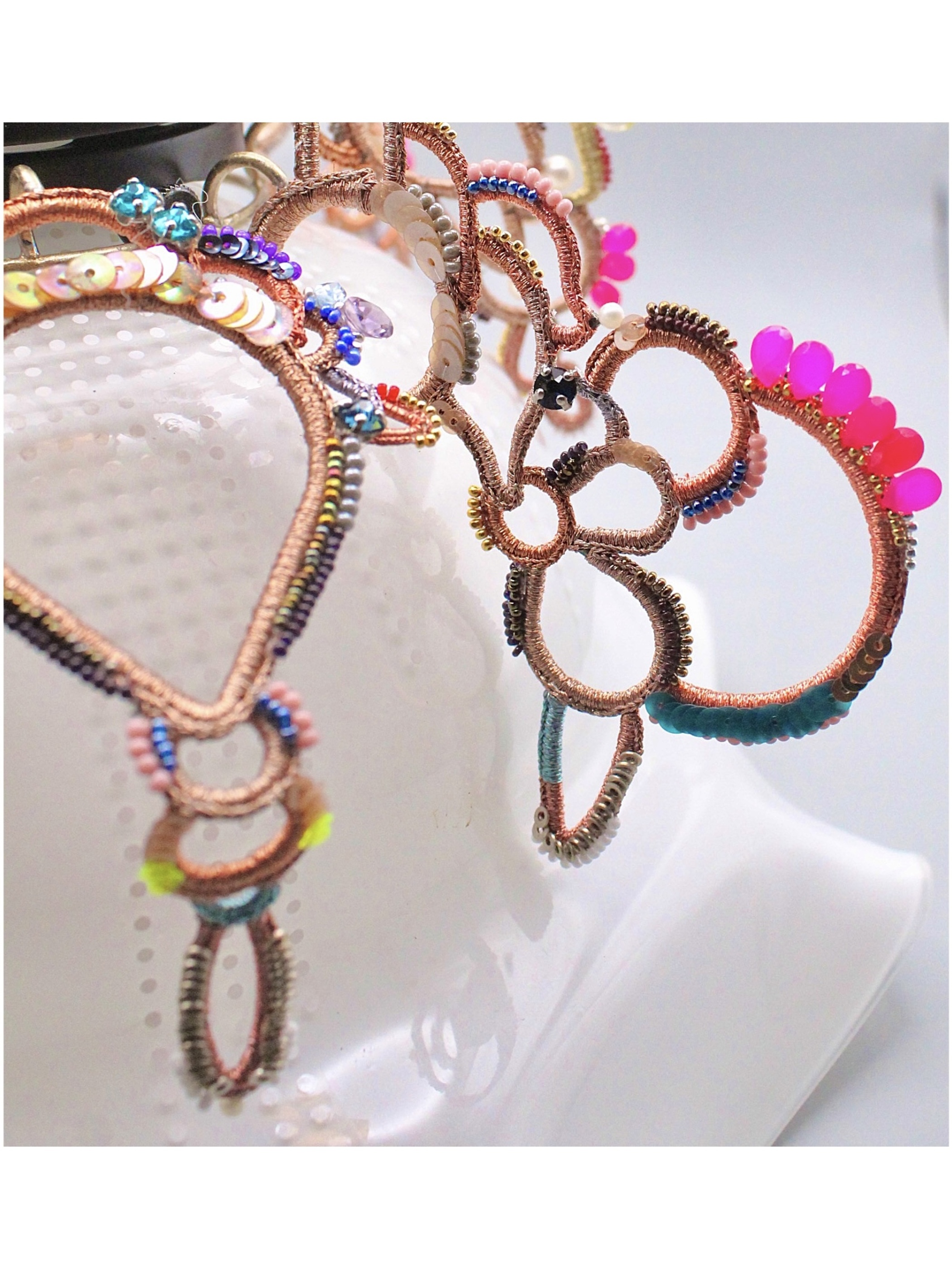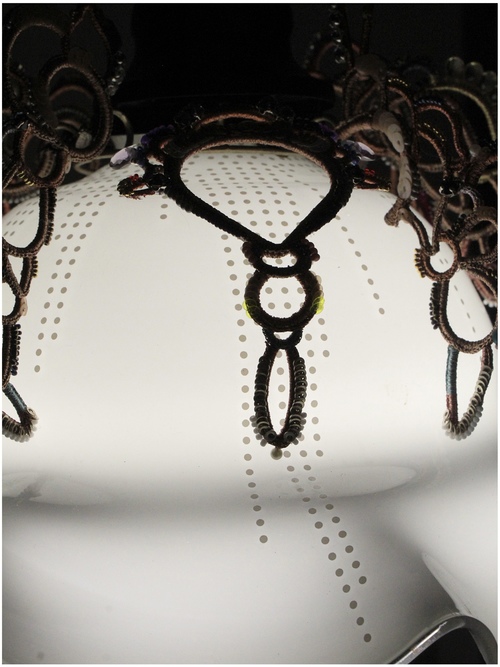ドッキングしたKNITTINGのモチーフに+してベースのシェードには白の水玉達が放射状に"たらぁ〜”と流れ落ちる様な感じに転写を施してちょっとした毒っ気を入れて綺麗だけではない世界観にしました。
