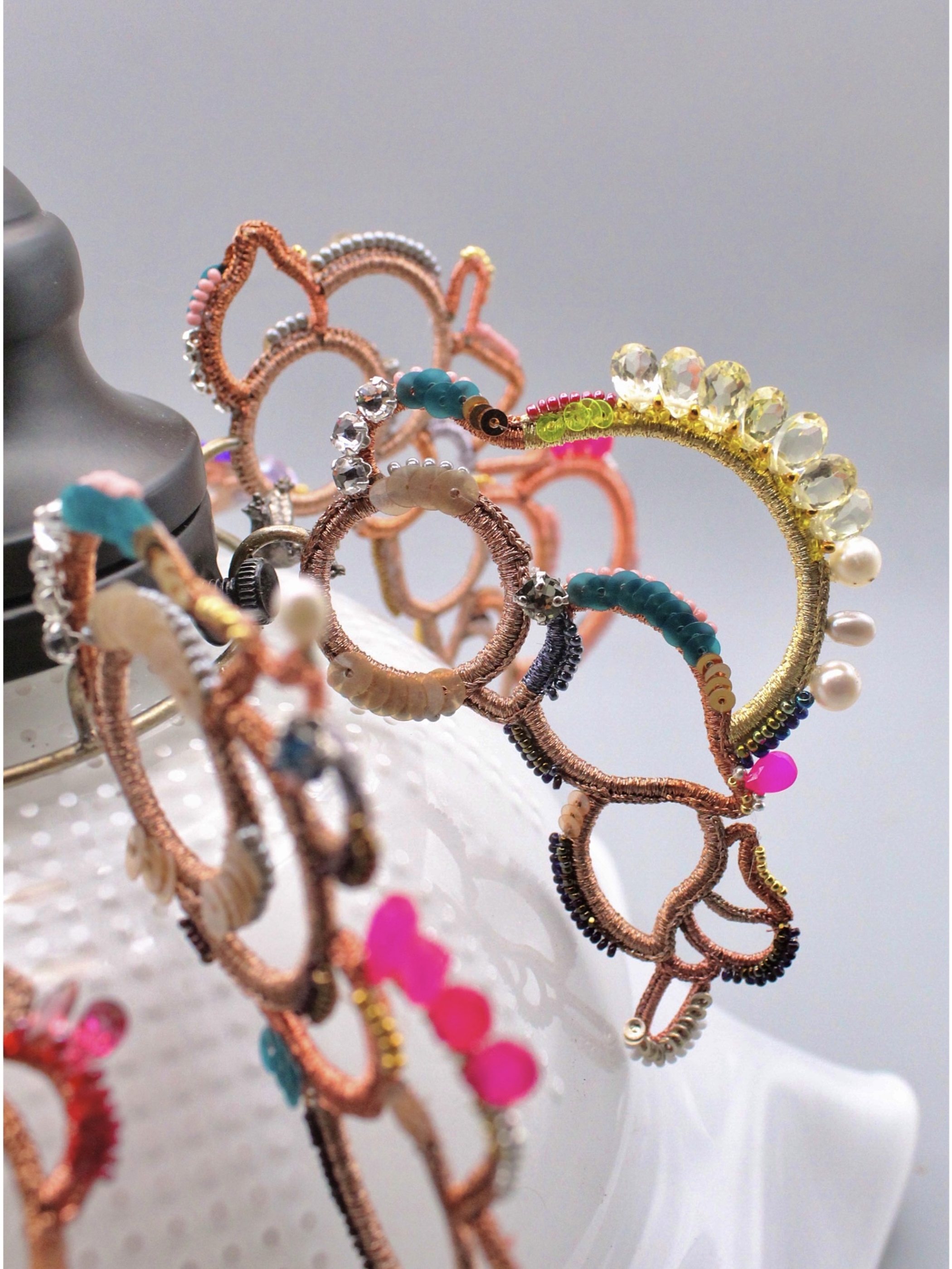 NEON PINKの「CHALCEDONY」やYELLOWの「LEMON QUARTZ」やAMETHYSTにBLUE TOPAZの天然石やPEARLに加えてどのモチーフにもSWAROVSKIのGLASS STONEも装飾したので通常でも光に反射してキラキラと輝きます。