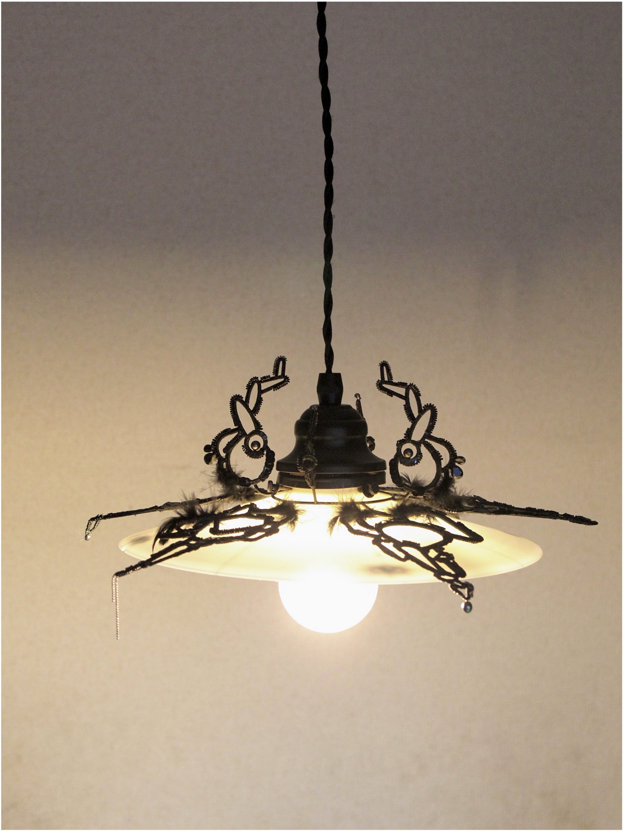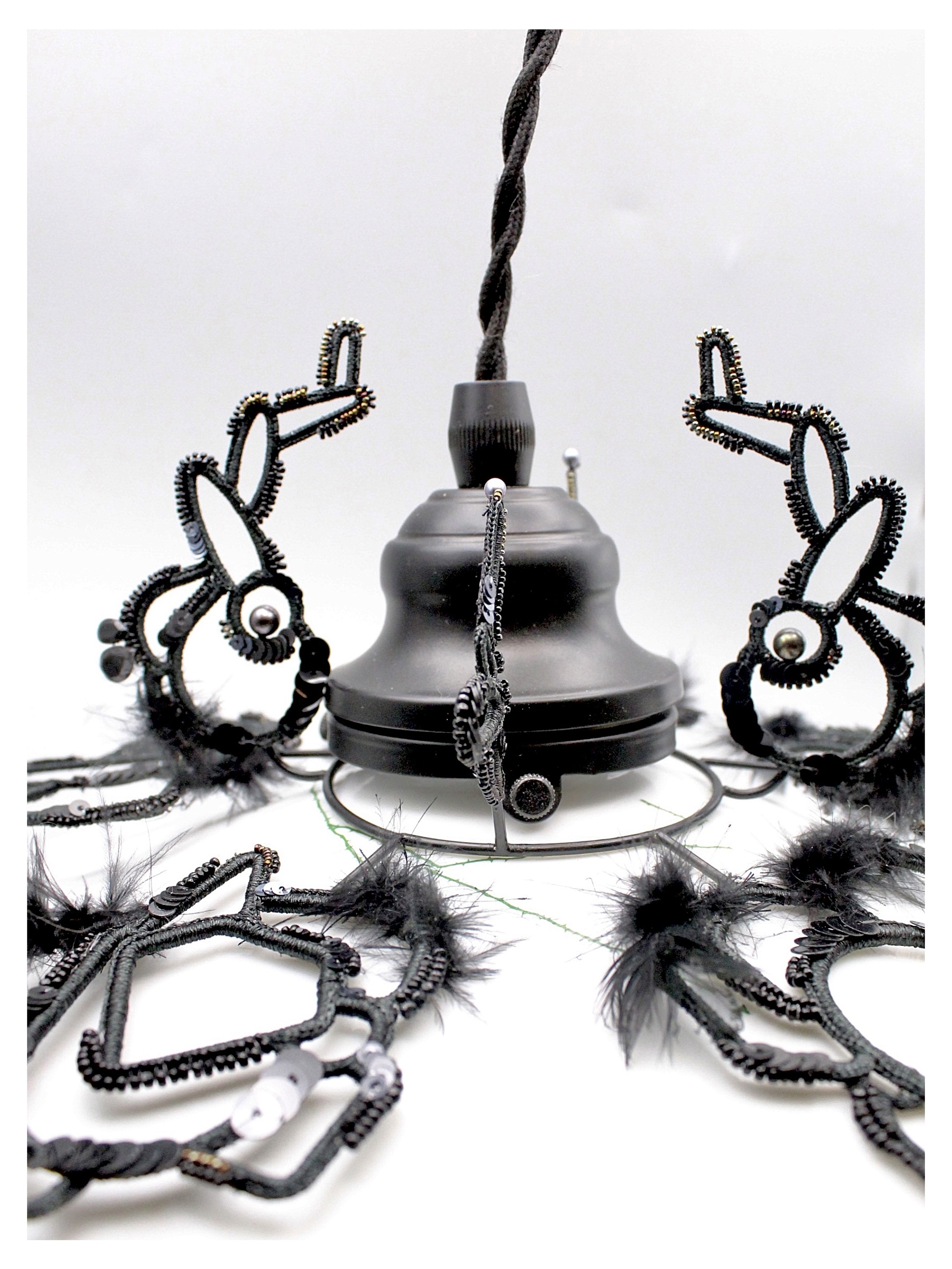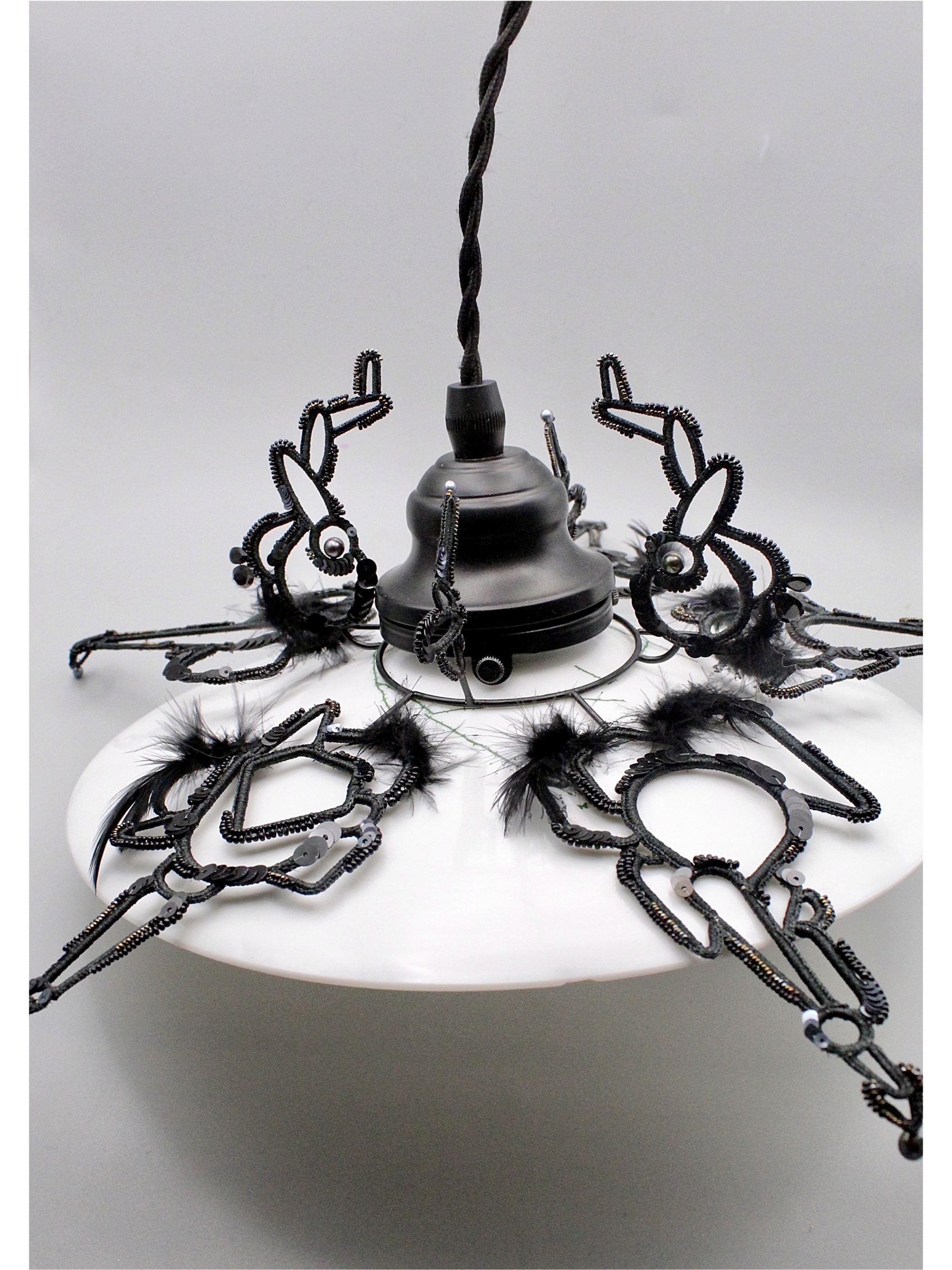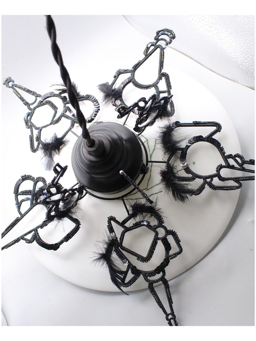 上部の金具に沿って伸びるモチーフも相まって黒い羽根を持った"ナニカ"の生き物がランプシェードを覆うイメージで制作しました。
