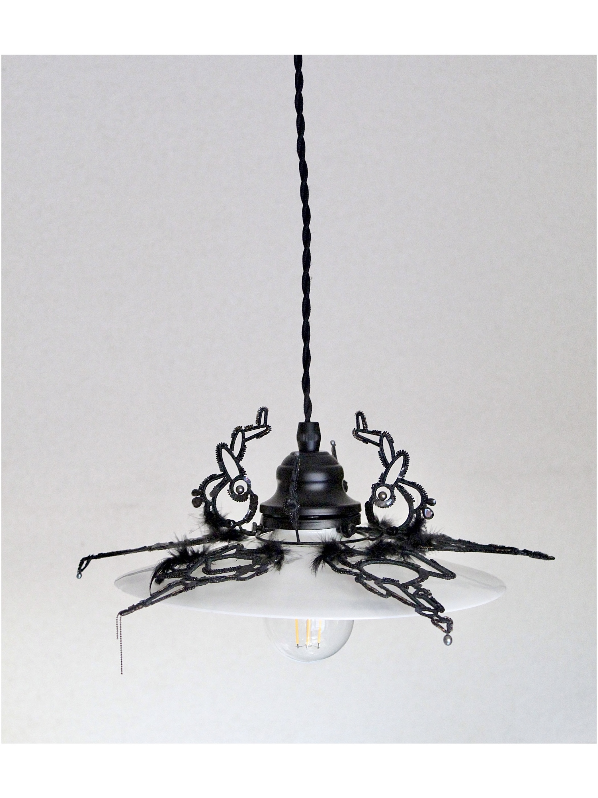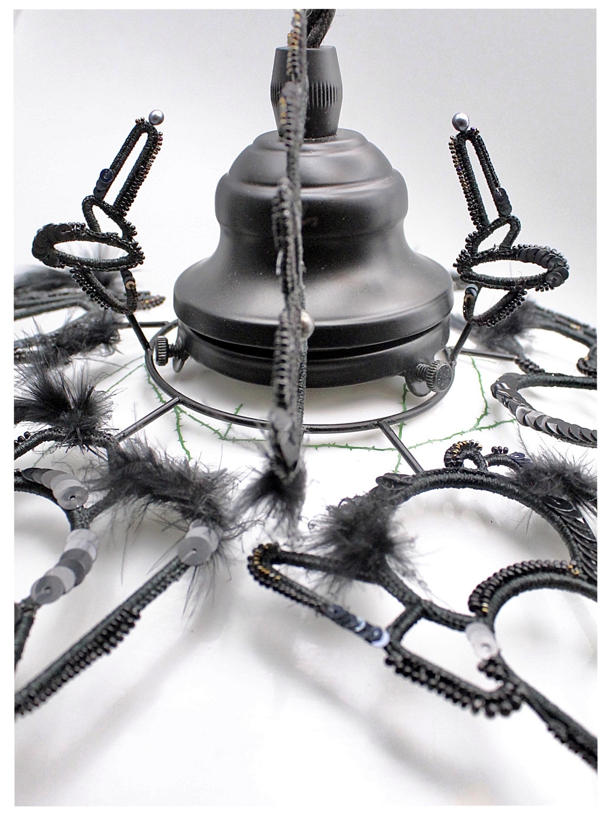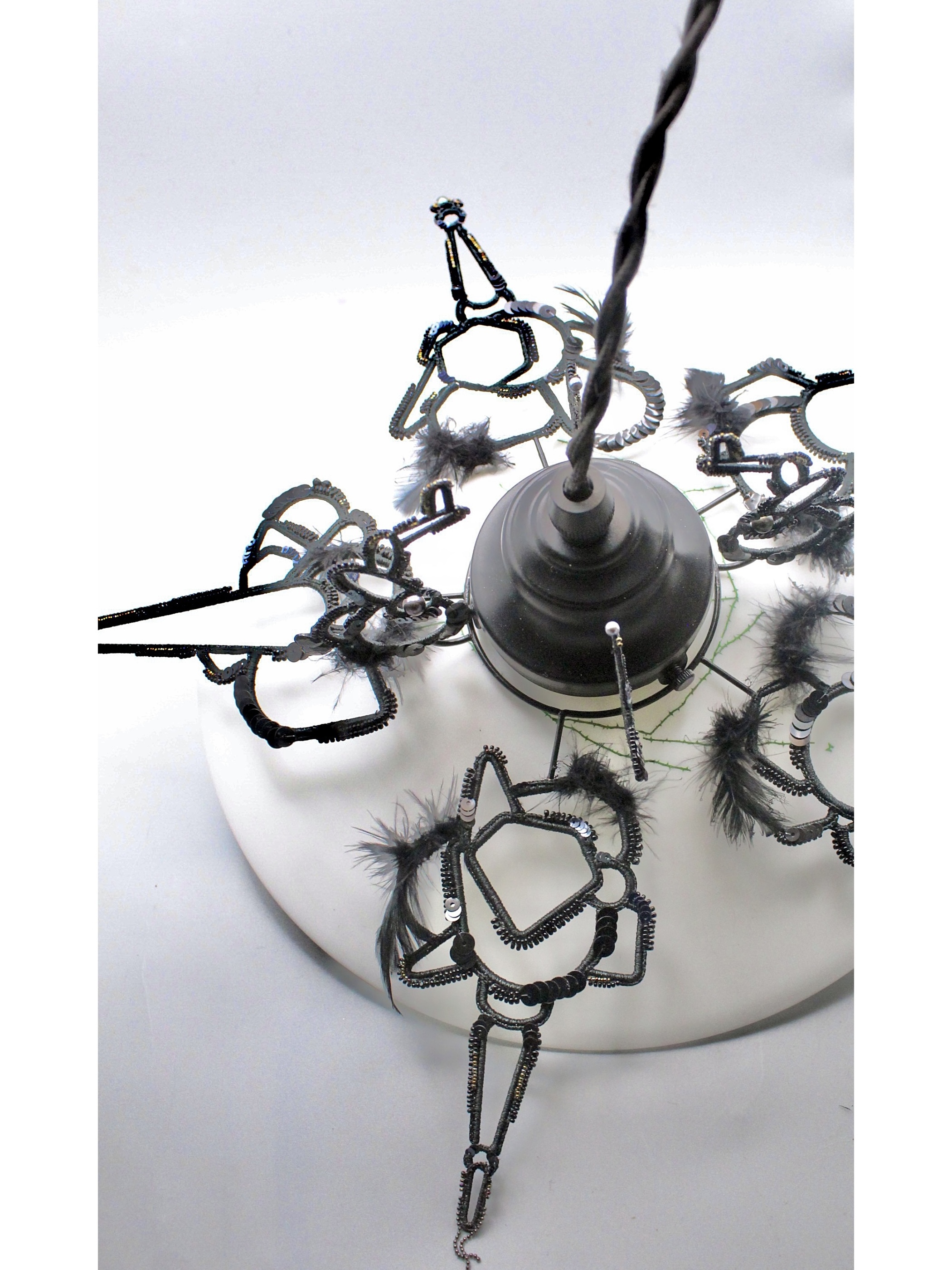 上部の金具に沿って伸びるモチーフも相まって黒い羽根を持った"ナニカ"の生き物がランプシェードを覆うイメージで制作しました。