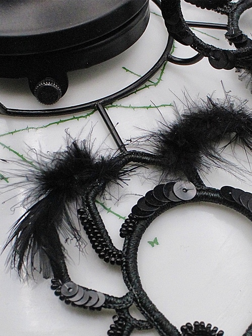ふわふわした黒い羽根も一緒に編み込んでちょっとした生き物感を込めました。
