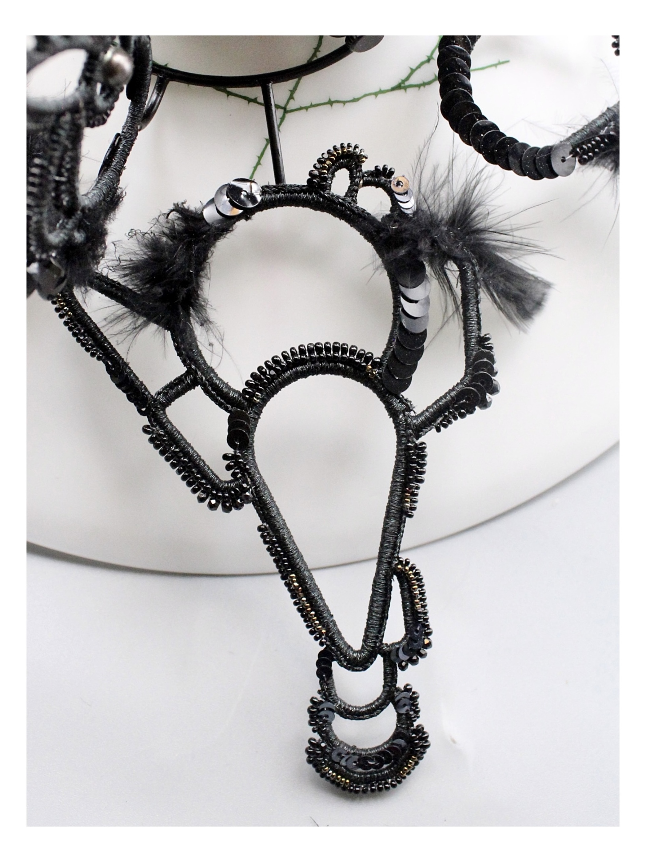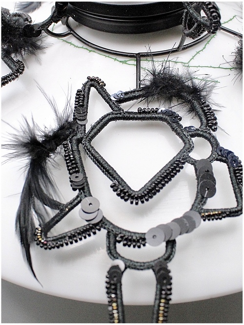 カラスを彷彿させる糸も装飾も真っ黒でまとめた剣先の様な翼の様なモチーフを放射状に配しました。