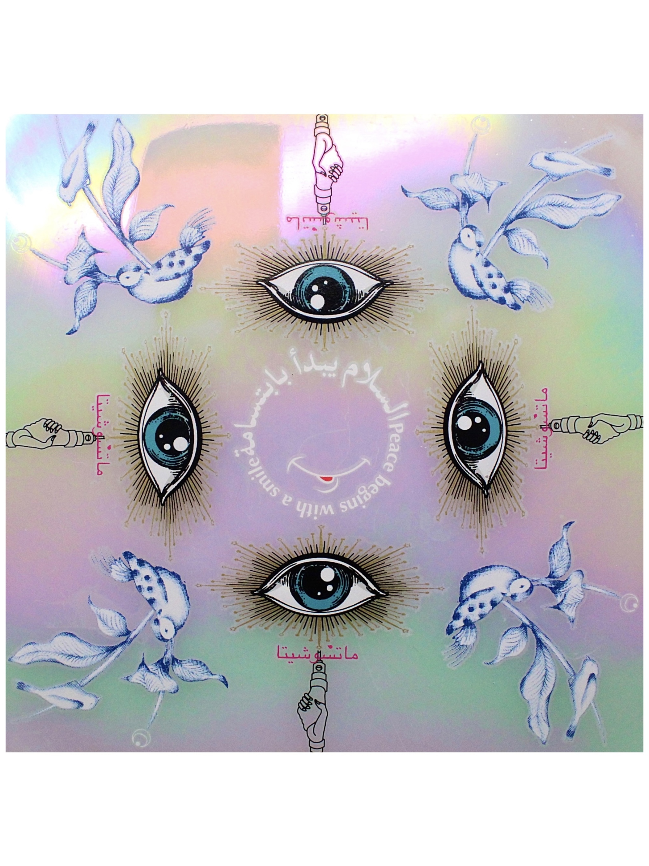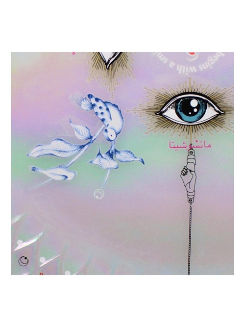 この七色に輝く地を活かして様々なモチーフをコラージュして万華鏡の様な作品にしました。