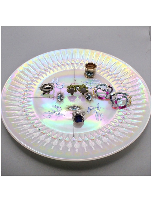 今回は約70年前に製作された虹色に美しく妖しく輝くちょっとサイケデリックな60年代という時代背景を連想させるvintageの無地のプレートを使用しました。